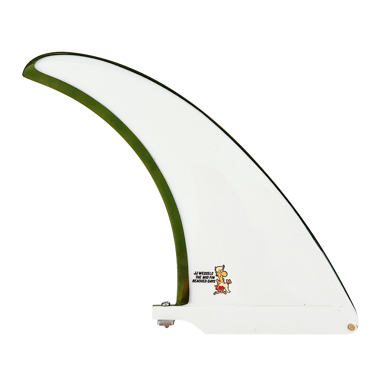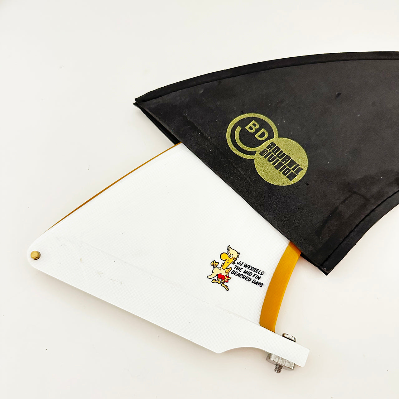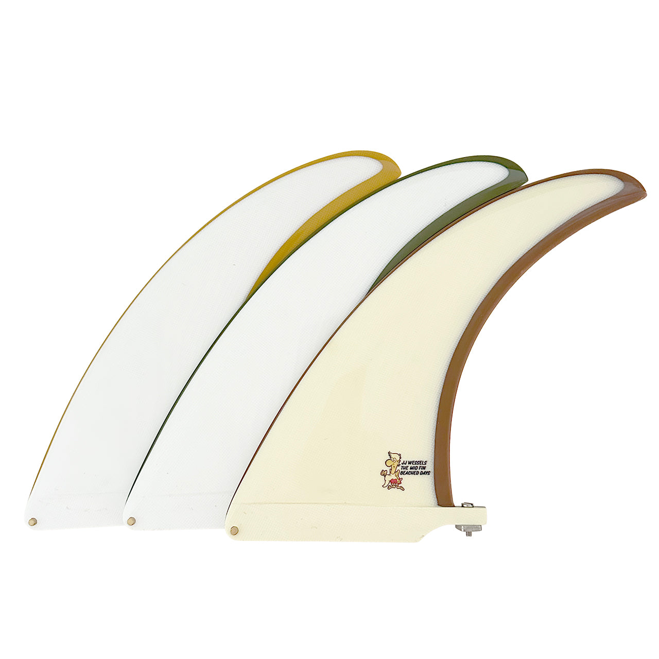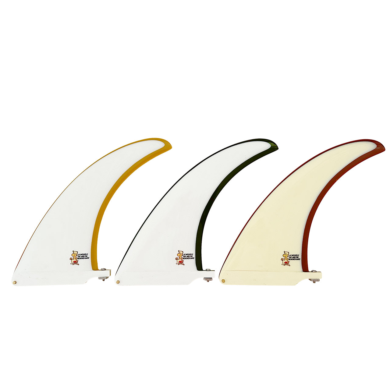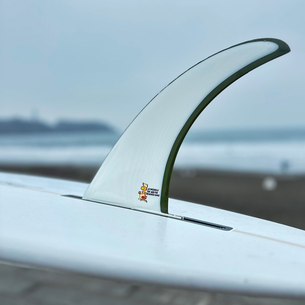 グラスファイバー製のフィンはサーフボードにも使われているクロスを積層し、レジンで固めた後に型を切り抜き、1本1本ハンドメイドでサンディングして仕上げています。そのグラスファイバーの特性によりターンの際にフィンが適度にしなり、戻るという動作(反発力)を得てボードのドライブが得られます。