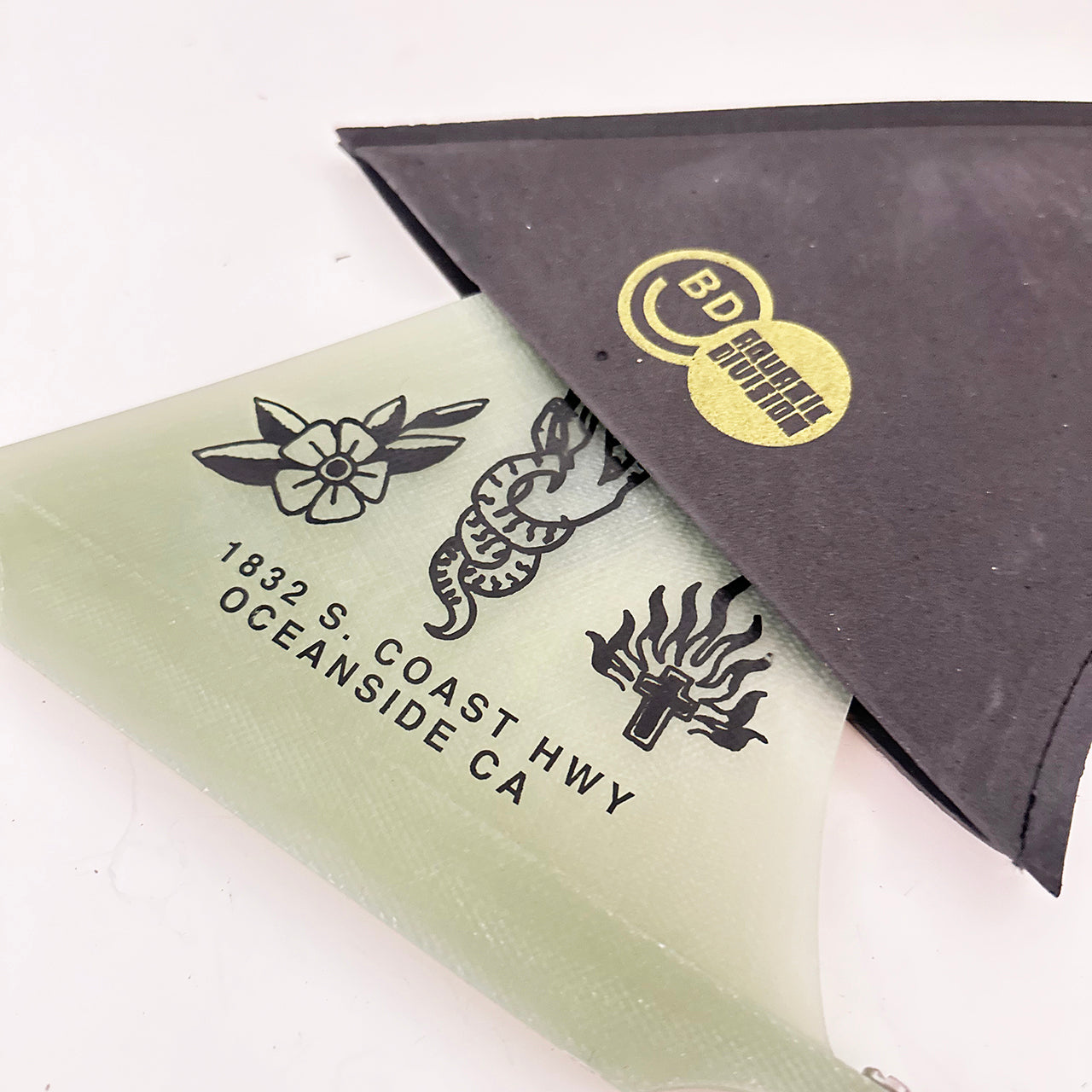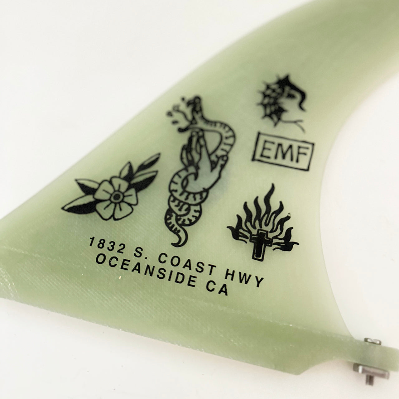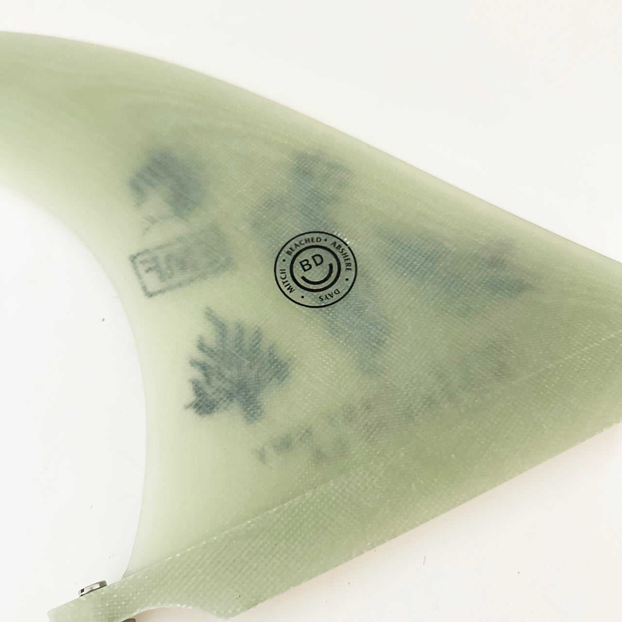 グラスファイバー(ボランクロス)の積層フィン、ボード全体からしなやかなフレックス(たわみ)を生み出すのが特徴で、ボトムからのスピードとターン時のドライブ性・推進力を高め、特にロングボードやレトロボードで粘り強くトリッキーなターンやマニューバビリティ(操作性)を求めるサーファーにオススメです。